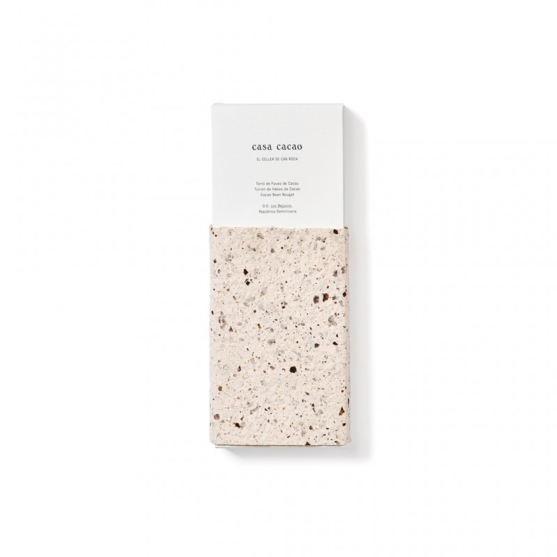 Turrón elaborado adaptando la receta del tradicional turrón de frutos secos pero sustituyendo estos últimos por habas de cacao. Lo presentamos en un formato de tableta grande de 500 g, elaborado con cacao de la denominación de origen D.O. Los Bejucos (República Dominicana), con cacao de la cosecha de 2019.