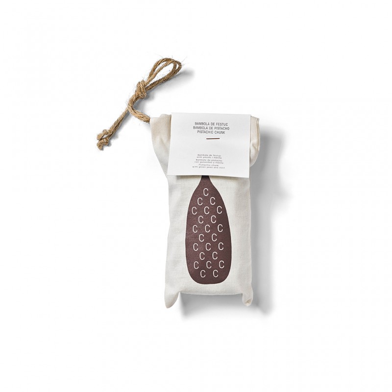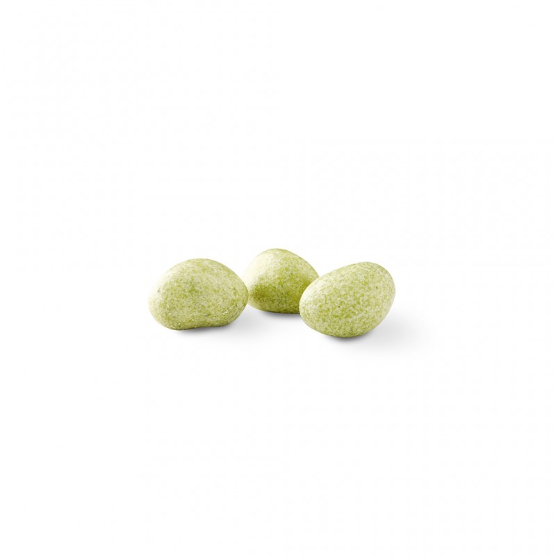 Pistachos de Les Garrigues tostados y recubiertos con cobertura de chocolate elaborado con guisantes y menta deshidratados.