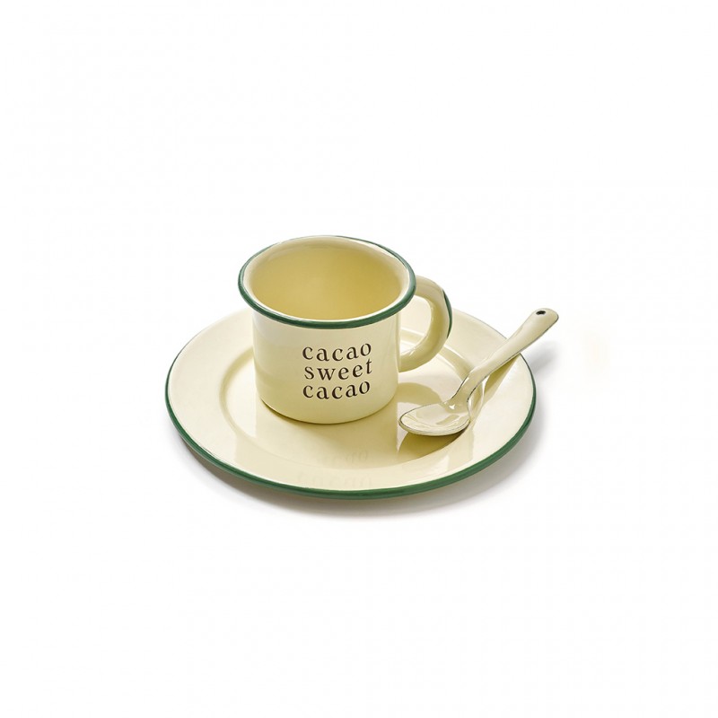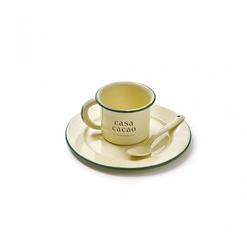 Conjunto de plato, cuchara y taza de peltre hecho en México, de color crema con el diseño especial de Casa Cacao. Capacidad de la taza: 300 ml.