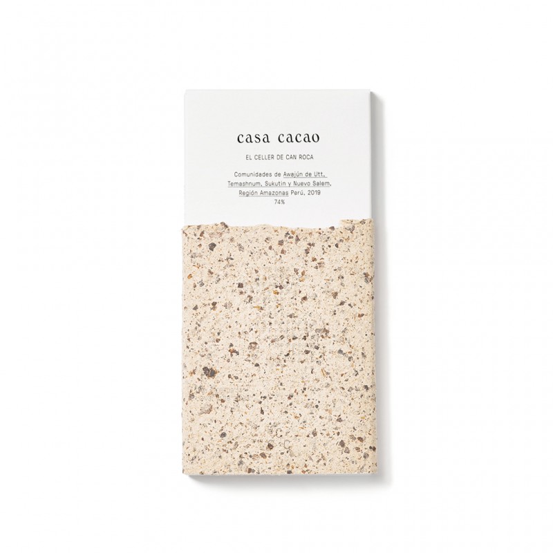 Cacao recolectado por la comunidad nativa awajún, originaria del Amazonas Peruano. Cacao de la variedad criolla, fermentado durante 4 días en el pueblo de Utt en cajones de madera, cubiertos con hojas de platanero y posteriormente secado en el mismo pueblo.
